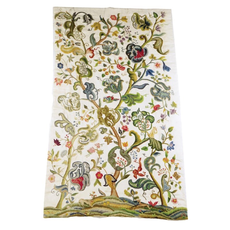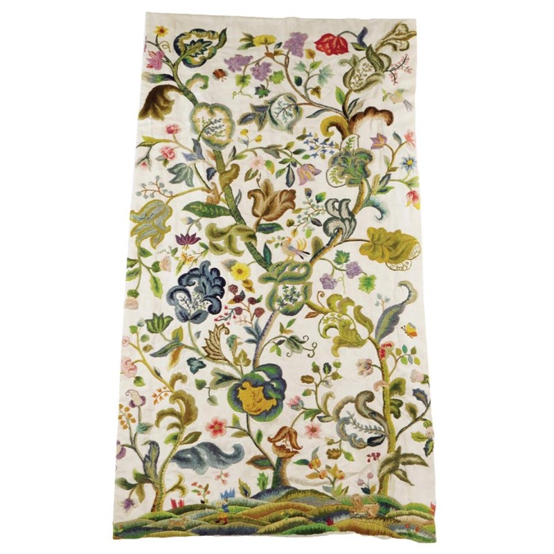 A pair of crewelwork hangings, embroidered with Tree of Life designs, with flowers, figures, a lion, a dog, a kingfisher, various birds, a monkey and a squirrel, early 20th century, 181 x 95cm. (2)