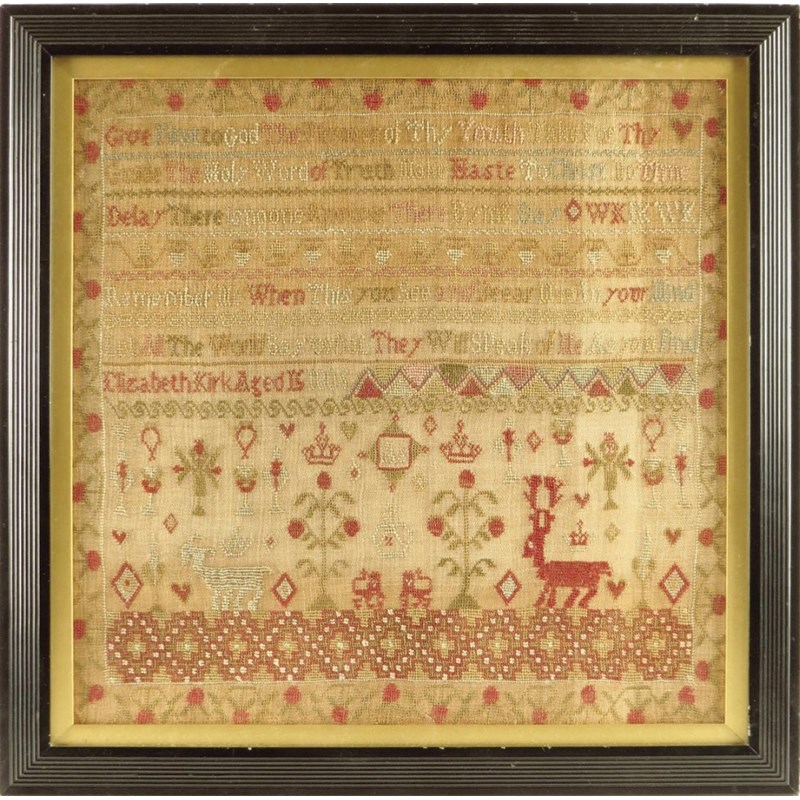 A Regency needlework sampler by Elizabeth Kirk, worked with a band of flowers with a verse, crowns, a stag, trees and signed 'Elizabeth Kirk Aged 15 1806', 39.1 x 39.2 cm, in a later glazed ebonized frame.
