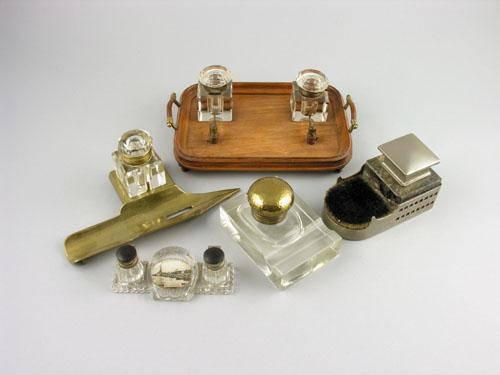 A brass novelty inkstand, as a pen nib with a glass well, 8in (20.2cm) w, another as a Liner deck with bristle pen wipe and three other inkstands. (5)