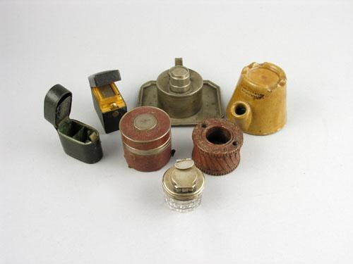 A Victorian stoneware inkstand, stamped 'H.Morrell, London' and registration lozenge for '24thFeb. 1883', 2.5in (6.3cm) h., two travelling wells, another turned treen, two leather covered vestas and a tin lamp. (7)