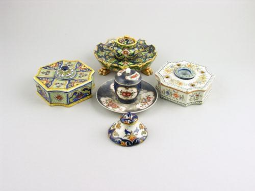 A tin glazed earthenware circular inkstand, with a central lidded well, 6in (15cm) dia, two square inkstands with concave corners, another of tapering form and a fifth with liner and lid. (5)