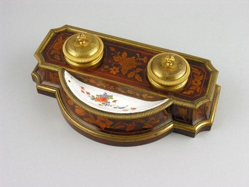 A late 19th century marquetry inlaid and a gilt brass mounted bow front ink stand, with an inset porcelain front, the wells with glass liners, one chipped, the base stamped '42210', 10.75in (27.2cm) w, 6in (15.2cm) d.