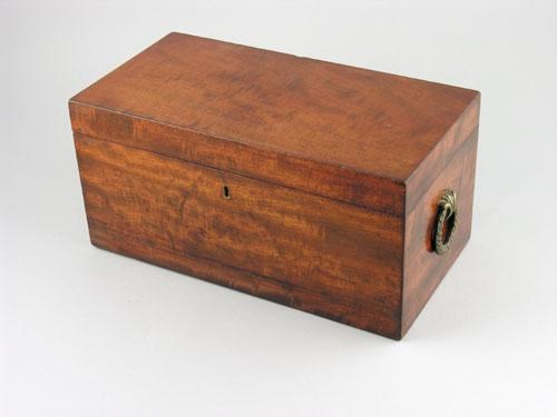 A William IV mahogany tea caddy by Gillow, of plain rectangular form with a central bowl aperture and two compartments, the brass lock stamped 'R.L&Co', the edge stamped 'GILLOW', the sides with cast foliate ring handles, 6.5in (16.5cm) h, 13.25in (33.6cm) w, 6.75in (17cm) d.