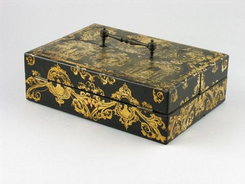 A Victorian papier mache and gilt decorated portable writing box, the turned brass carrying handle to a fitted interior, 4.5in (11.5cm) h, 10.5in (26.5cm) w, 7.5in (19cm) d.