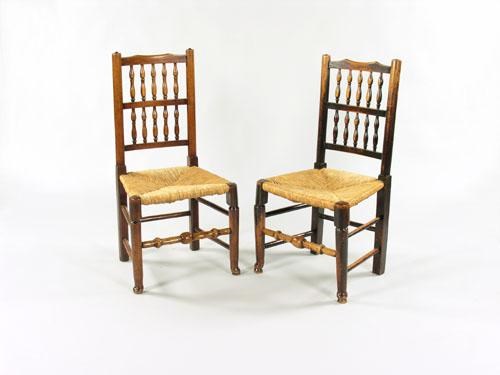 A harlequin set of eight spindle back chairs, in ash and alder with rush seats, 19th century. (8)