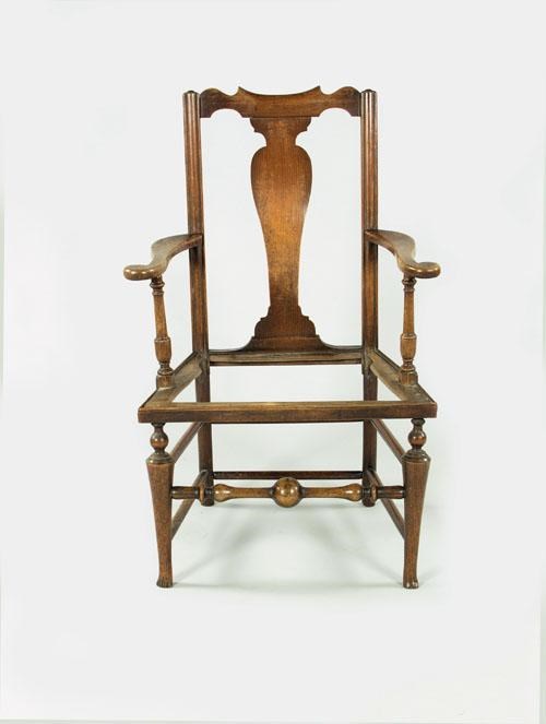 A George III ash open armchair, the shaped top rail above a curved vase shaped splat, to scroll arms, seat missing, on turned knop and tapering legs.