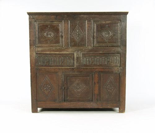 A late 17th century panelled oak cupboard, having an arrangement of three doors and a pair of drawers with carved lozenges and thumb nail arcading, patches to front framing, 53.75in (136.5cm) h, 52in (132cm) w, 19.25in (49cm) d.
