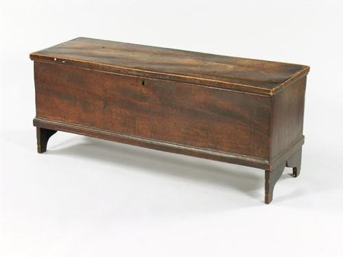 An 18th century elm boarded chest, the interior with a lidded till, on cut out ends with an applied base moulding, 18.75in (47.5cm) h, 45.25in (115cm) w, 15.25in (38.7cm) d.