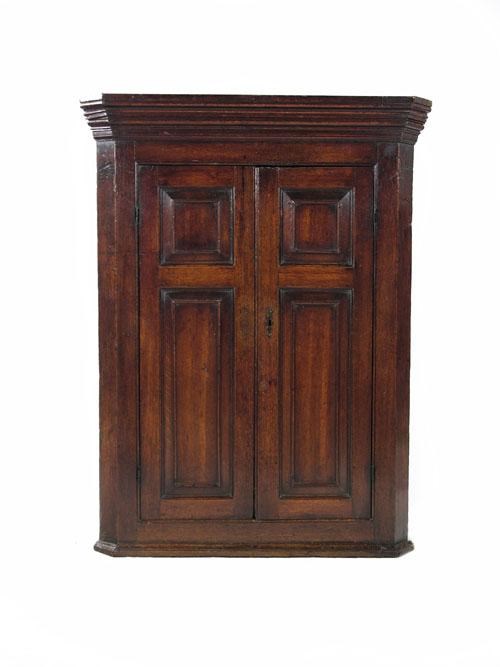 A late George III oak hanging corner cupboard, the moulded cornice above a pair of panel doors, enclosing three shaped shelves, 45.5in (115.5cm) h, 34.75in (88.2cm) w, 19.5in (49.5cm) d.