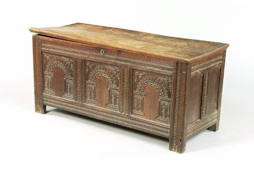A Charles II oak chest, the later elm top with an applied edge to a carved triple panel front, the moulded stiles with guilloche carving, 25in (63.5cm) h, 52.5in (133.3cm) w, 21.5in (54.6cm) d. Top warped. Probably South Wiltshire.