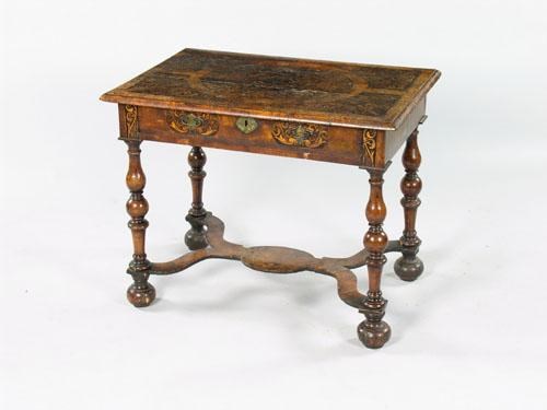 A William & Mary walnut and marquetry inlaid side table, the moulded edge top with banding and stringing, foliage and two central birds, above a frieze drawer fitted brass plate handles, turned leg united by a shaped 'x' stretcher, to bun feet, 26.75in (68cm) h, 34.25in (87cm) w, 22.25in (56.5cm) d. Crack to top, old worm.