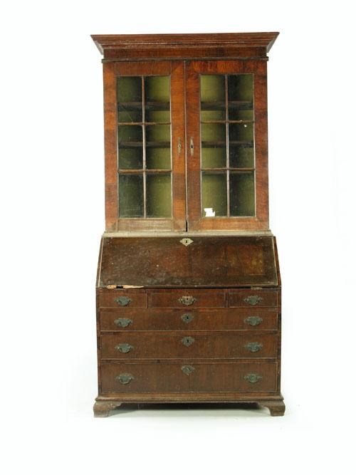 A walnut bureau bookcase, the moulded cornice above a pair of astragal glazed doors enclosing adjustable shelves, the baize lined fall to a shaped interior with central pull out cupboard with secret drawers, flanked by pilasters compartments to pigeon holes and drawers, above three frieze drawers and three long graduated drawers, on ogee bracket feet, distressed , 18th century and later, 88in (223.4cm) h, 44.75in (113.7cm) w, 25in (63.5cm) d.