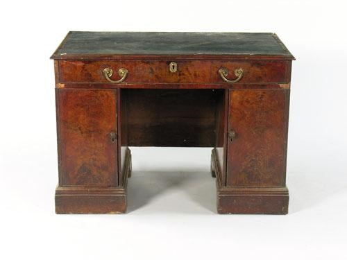 An early George III mahogany kneehole desk, the later leatherette inset top above a later divided frieze drawer, fitted later handles above a pair of cupboard doors enclosed in three oak drawers fitted open brass plate handles, on solid plinth fronts and bracket feet sides, previously on castors.