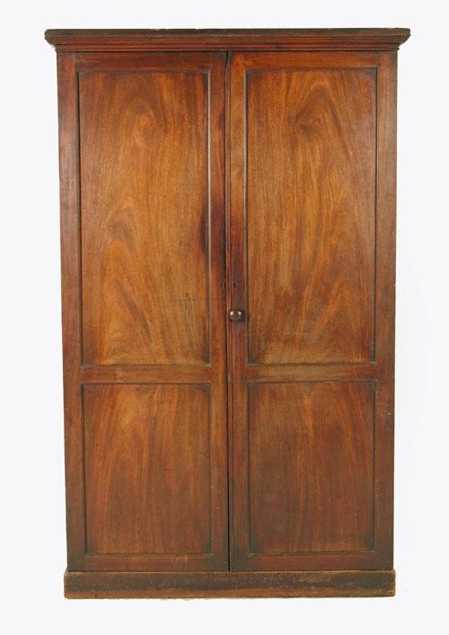A George III mahogany wardrobe, the moulded cornice above a pair of panelled doors enclosing a hanging rail and hinged pegs, on a plinth base, 70.5in (179cm) h, 44.75in (113.6cm) w, 23in (58.4cm) d.