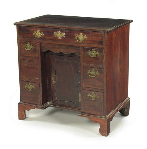A mahogany kneehole dressing table, the applied cusp cornered moulded edge top above a frieze drawer, three drawers each side flanking a shaped front shallow drawer and a panel cupboard door, 30.5in (77.4cm) h, 30in (76cm) w, 19.5in (49.5cm) d.