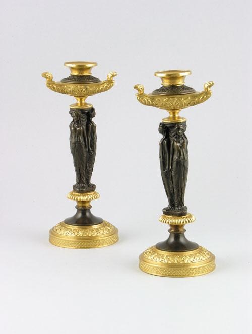 A pair of 19th century bronze and ormolu figural candlesticks, in Grecian revival style 9.5in (24.1cm) h, 3.5in (8.9cm) w. (2)