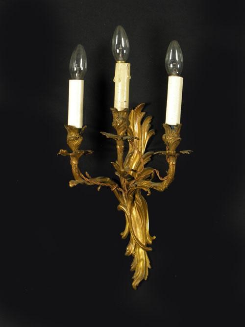 A pair of gilt brass three light wall lights, of scroll leaf design, drilled and filled for electricity, 22 x 10.5in (56 x 26.5c). (2)