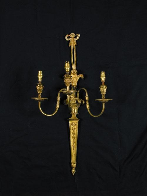 A pair of gilt brass three branch wall lights, modern, 25in (63.5cm) h, 13in (33cm) w. (2)