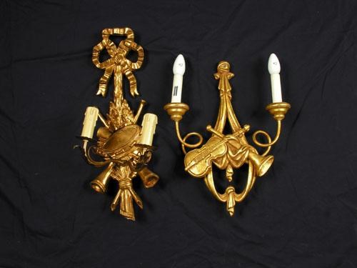 Three modern gilt composite two branch wall lights, the backs as draped musical trophies, 17.5 x 14in (44.4 x 35.5cm) and three others with ribbon tied backs. (6)