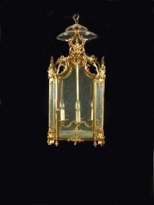 A 19th century brass and glass panelled square hall lantern, with canted corners, with a later four light fitting, 34.5in (87.5cm) h, 15.25in (38.6cm) w.
