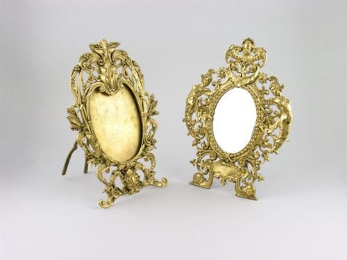 A late 19th century oval gilt brass easel back mirror, the pierced frame with a cherub surmount, herms and snails to the base flanking a vacant cartouche, 13.25 x 9.75in (33.5 x 24.7cm) and another shaped oval frame. (2)