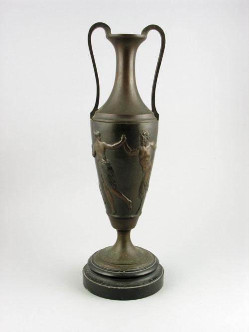 A bronze amphora shape vase, the body relief decorated Bacchus with dancing maidens, with detachable top, the base drilled, on a turned slate socle, 19in (48.2cm) h.