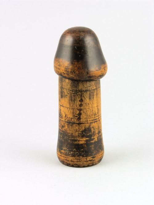 A turned treen lidded container, with traces of red paint, possibly a dice shaker, 6.25in (16cm) h.