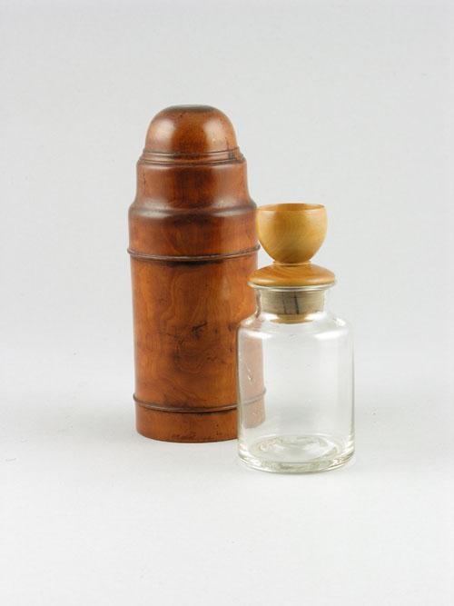 A Victorian turned boxwood bottle case, with original glass bottle and stopper, 6.75in (17.1cm) h.