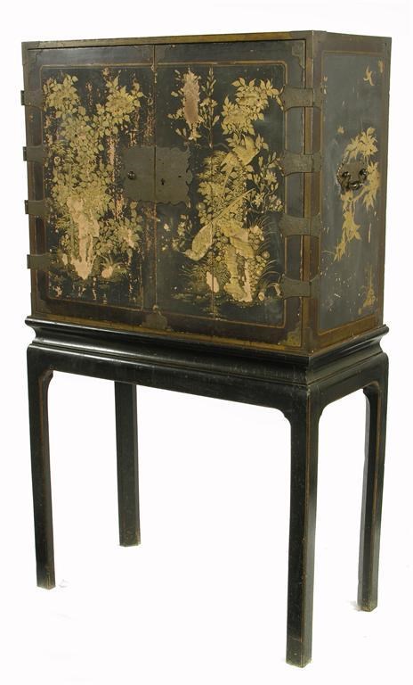An 18th century Japanned cabinet on stand, in distressed condition, the pair of cupboard doors enclosing adjustable shelves, with engraved brass mounts and side carrying handles, 63.5in (161.5cm) h, 37in (94cm) w, 17.75in (45cm) d. (2)