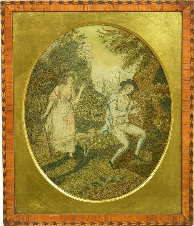 An early 19th century needlework picture of a shepherd and shepherdess, and a silkwork picture of a lady with a dog, 14.5 x 12.25in (37 x 31.2cm), both in walnut feather banded frames. (2)