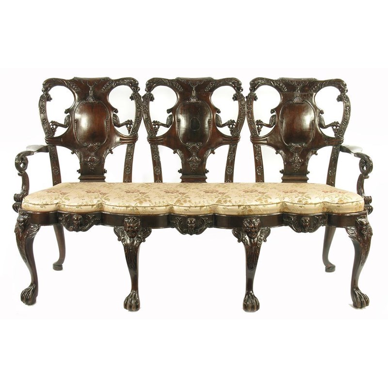 An Irish mahogany triple chair back settee, by M Butler & Co, Dublin, the eagles head top rails above a cartouche shaped splat with carved shells, tassels and grapes issuing feathered taloned legs, the uprights with carved foliage decoration, the scroll arms with birds head terminals on further scroll supports to a shaped front drop-in seat, the frame stamped 'M Butler & Co Dublin,' the frieze carved female and grotesque masks to leaf carved scroll legs with paw feet, 39.75in (101cm) h, 64.75in (164.5cm) w, 24.5in (62cm) d.