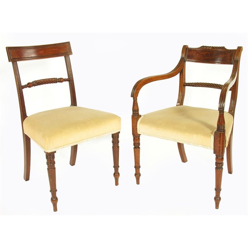 A set of eight late Regency mahogany dining chairs, with rope twist bar backs and stuffed over seats comprising: a single open armchair and seven side chairs, together with a similar open armchair. (9)