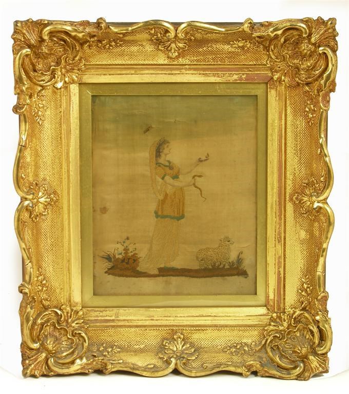 An early 19th century silkwork picture, of a woman holding a snake, 9.5 x 7.75in (24.2 x 20cm), in a carved gilt frame.
