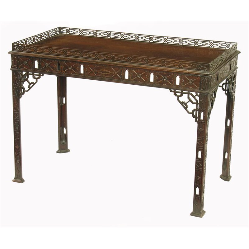 A mahogany rectangular silver table, the pierced fret galleried top above a blind fret and pierced arcaded frieze on conforming legs with pierced brackets to stepped block feet, 30.25in (76.5cm) h, 42.5in (108cm) w, 22in (56cm) d. Early 20th century.