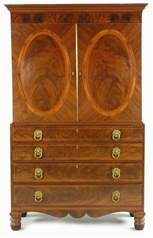 Channel Islands. A Regency mahogany linen press, inlaid stringing, the detachable cornice above a pair of rosewood banded oval panel doors enclosing two slides, the four long drawers fitted embossed shell brass plate handles, the shaped apron on turned and ebonised feet, 82in (208.3cm) h, 51.25in (130cm) w, 22.25in (56.4cm) d.