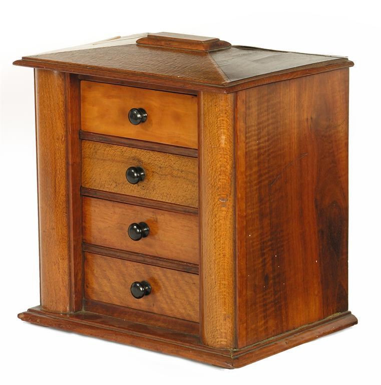 A 19th century specimen wood small chest of four drawers, veneered in walnut, sandalwood and other exotic woods, 11.5in (29cm) h, 11.5in (29cm) w, 8.5in (21.4cm) d.