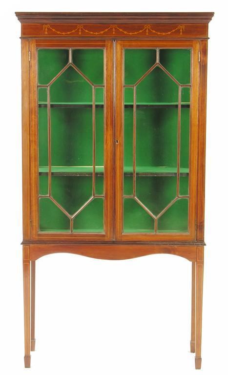 A mahogany display cabinet, with marquetry and stringing, with a pair of glazed doors enclosing later baize lined shelves, 59.25in (150.5cm) h, 32in (81cm) h, 11in (28cm) d.
