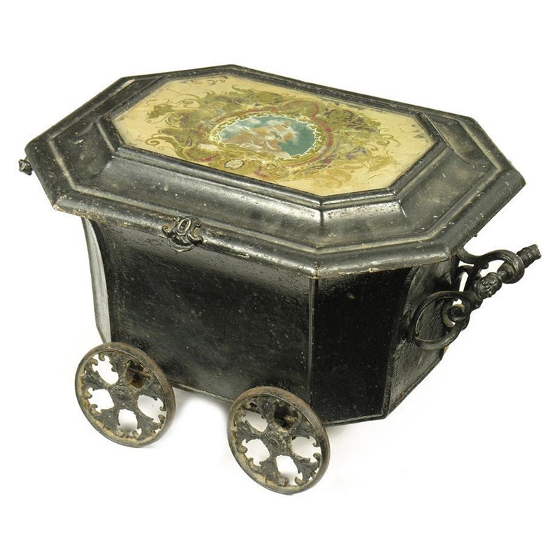 A Victorian tole sarcophagus shape wine cooler, the hinged cover with an inset panel depicting Ariadne on panther within a gilt border, open side handles and on wheels, registration lozenge, 14.5in (37cm) h, 25in (63.5cm) w, 17in (43cm) w.