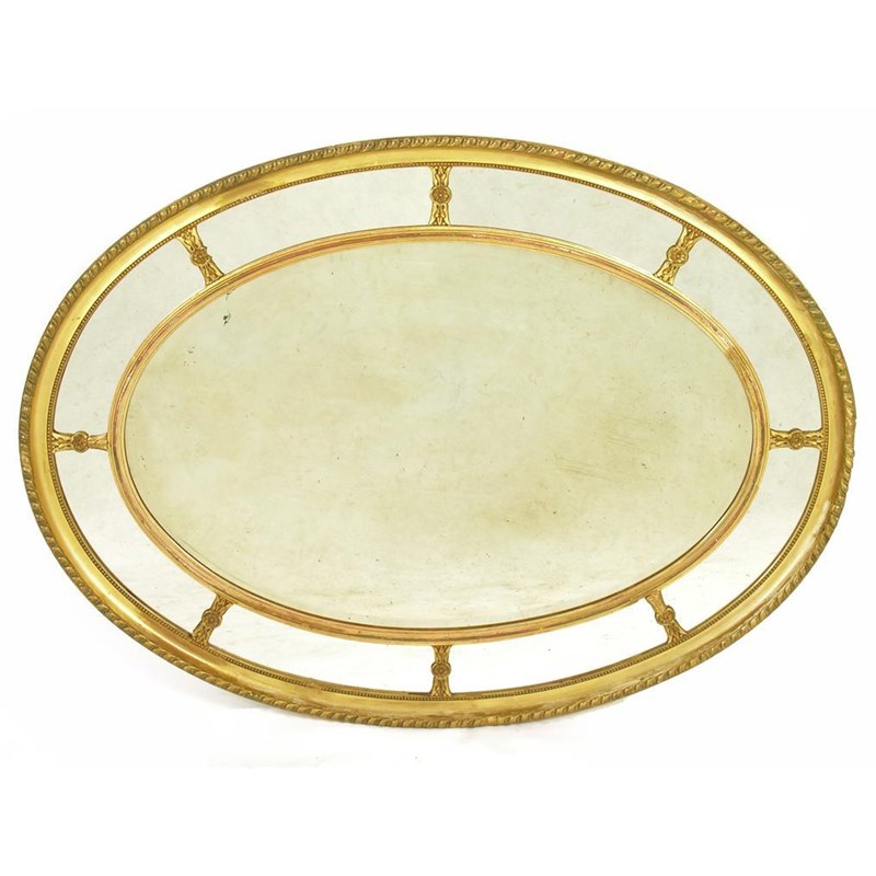 A late 19th century oval giltwood wall mirror, with a central bevelled plate, reeded border with floret and leaf divisions to a gadroon outer edge, 44.5 x 33in (113 x 84cm).