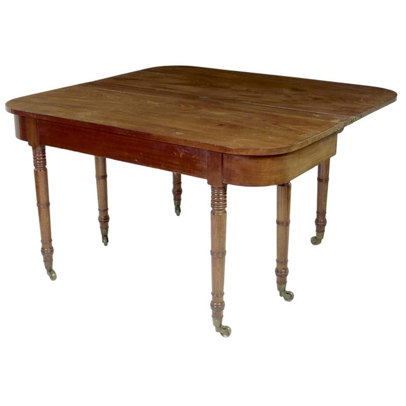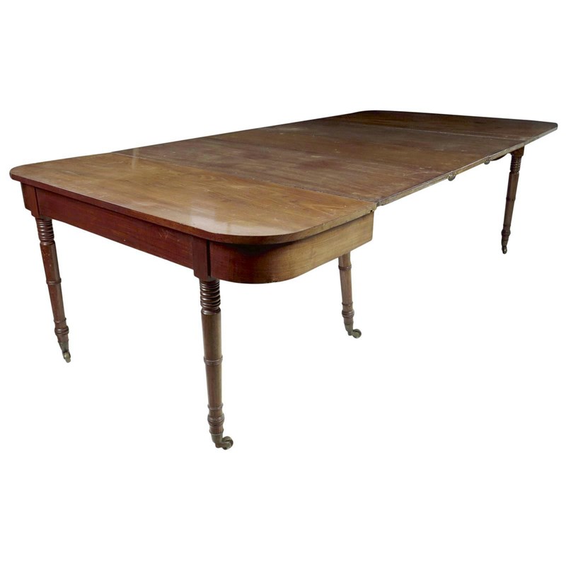 A Regency mahogany extending dining table, the part hinged fold-over top to a concertina action extending to accommodate three additional leaves, on ring turned tapering legs terminating in brass caps and castors, 72.5cm high, 132cm wide, 268cm long.