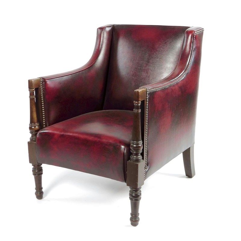 A mahogany armchair upholstered with red leather, with turned column front supports, on turned tapering legs.