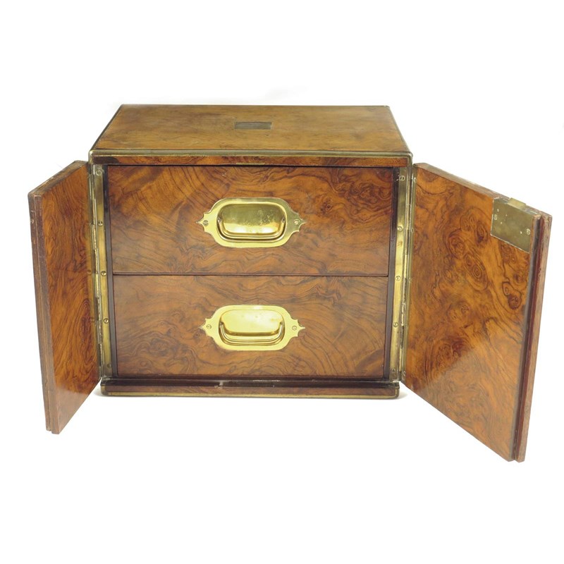 A Victorian walnut and brass mounted table cabinet, the top centred a vacant brass plaque, above two doors enclosing two drawers originally with divisions, with sunken brass handles and a Bramah lock, no key, 25.7cm high, 30.6cm wide, 22.2cm deep.