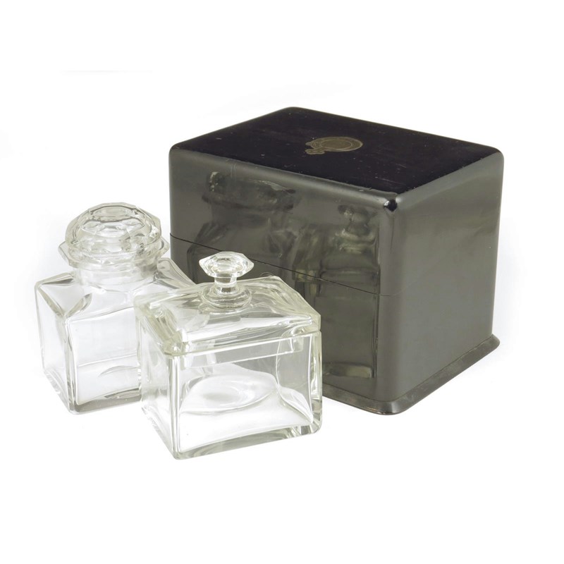 A 19th century continental ebonised scent bottle box, the hinged lid inlaid a brass garter, to a stepped divided and plush lined interior, with a glass box and cover and a scent bottle and stopper, 15.3cm high, 20.7cm wide, 15.4cm deep.