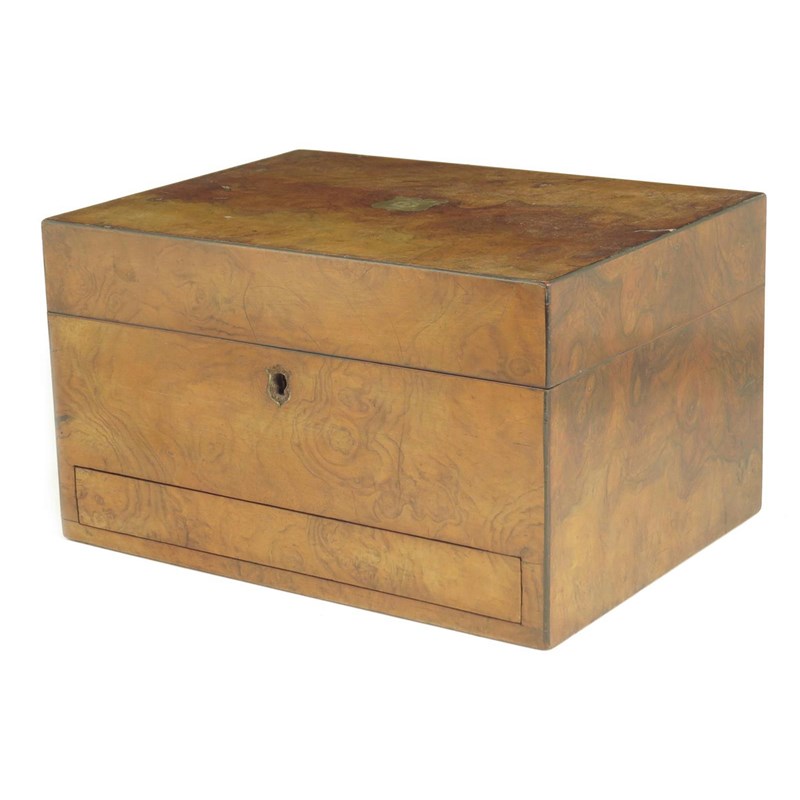 A Victorian walnut toilet box, with ebonised edging, the hinged lid inset a brass shield inscribed with a monogram and the date 'DECR. 18TH 1876', the underside of the lid with a leather framed mirror and a divided leather pull-out tray with various silver plated lidded jars and boxes, with mother of pearl handled utensils to a sprung plush lined base drawer, 17.8cm high, 31cm wide, 23.2cm deep.