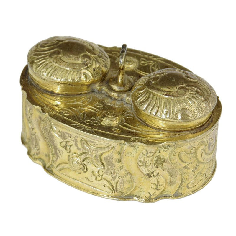 A mid 18th century gilt metal travelling inkwell and sander, with rococo decoration 5.5cm wide.