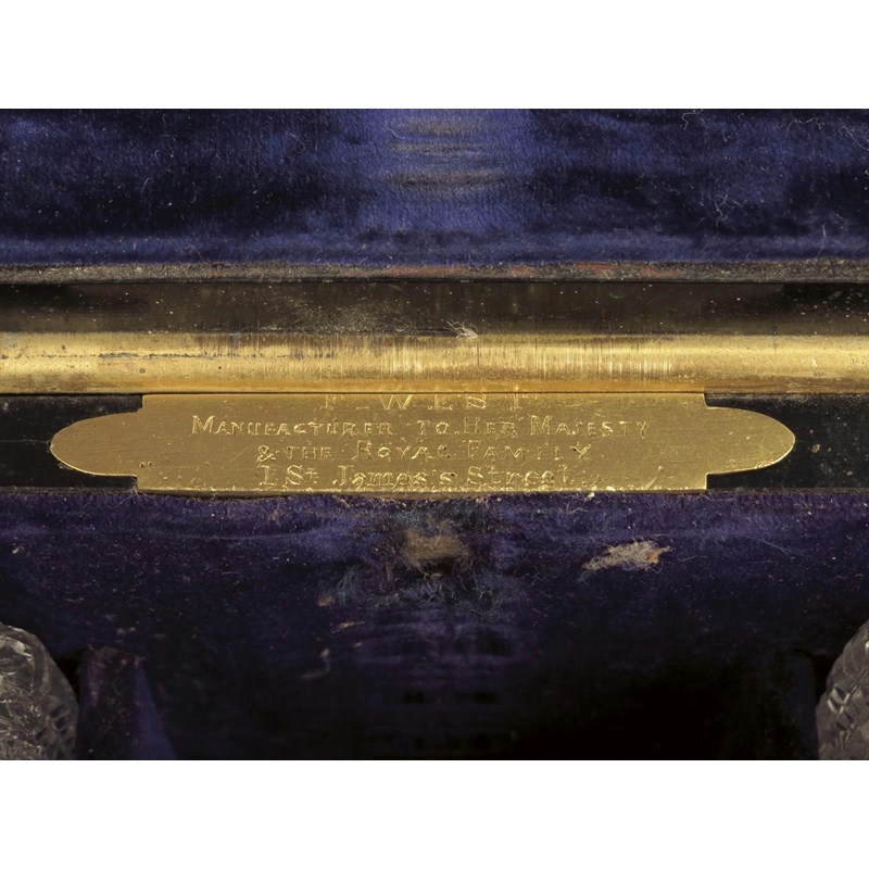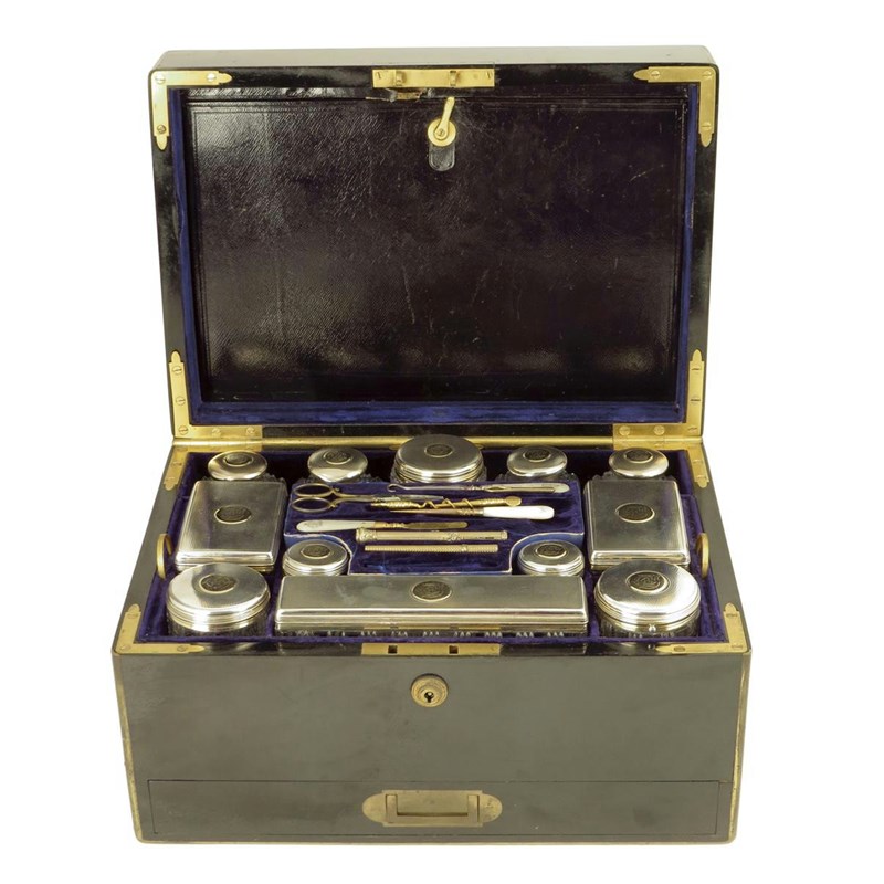 A Victorian ebony and brass mounted travelling toilet box by F. West, the hinged lid inset a monogram 'ECC', to a plush and leather lined interior, the lid inset a pouch and previously a hand mirror, to twelve cut glass and engine turned silver gilt topped bottles, jars and boxes, all with a monogram, by J. B, London 1870, fitted with various utensils and implements including a corkscrew, stamped 'F. WEST MANUFACTURER TO HER MAJESTY & THE ROYAL FAMILY, 1 ST. JAMES'S Street', with a Bramah lock, with side carrying handles and with a base drawer for jewellery, 19.5cm high, 35.6cm wide, 25.7cm deep.