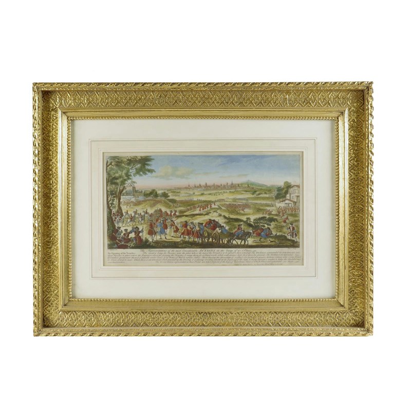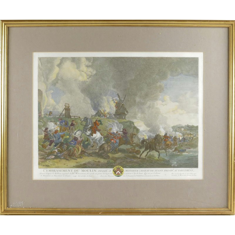 After Philips Wouvermans (1619-1668). 'L'EMBRASEMENT DU MOULIN', a coloured engraving together with two other engravings from the same series, 37.2 x 49cm, together with military engravings after Jacques Rigaud, including 'The Assault on the main body of the Place', all mounted, framed and with gilt frames. (6)