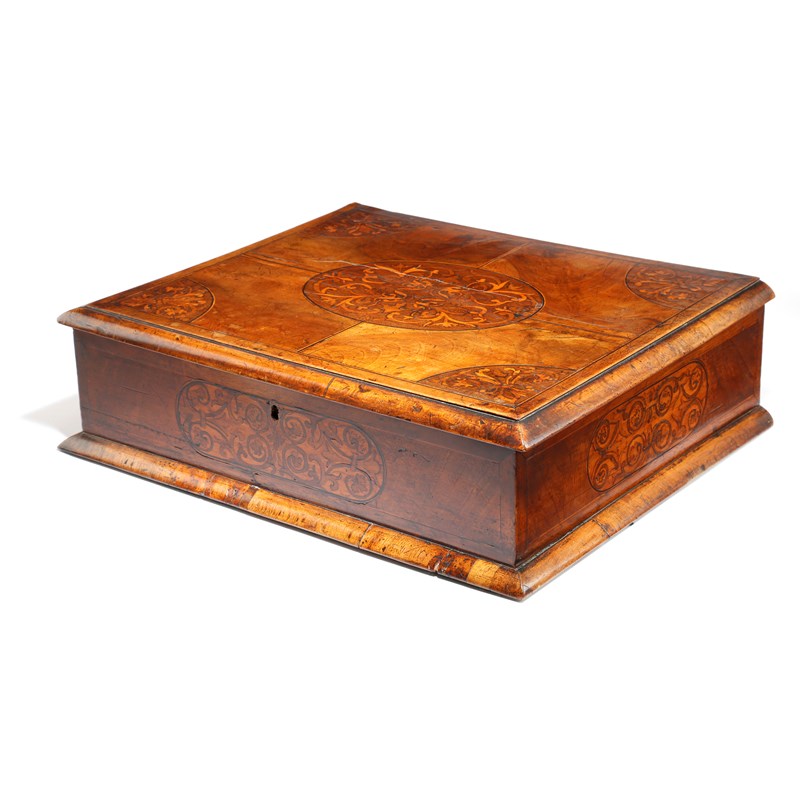 A William and Mary walnut lace box, inlaid with panels of seaweed marquetry, the quarter veneered hinged lid with foliate spandrels, the interior later lined in green velvet, 12.2cm high, 44.7cm wide, 36.2cm deep.