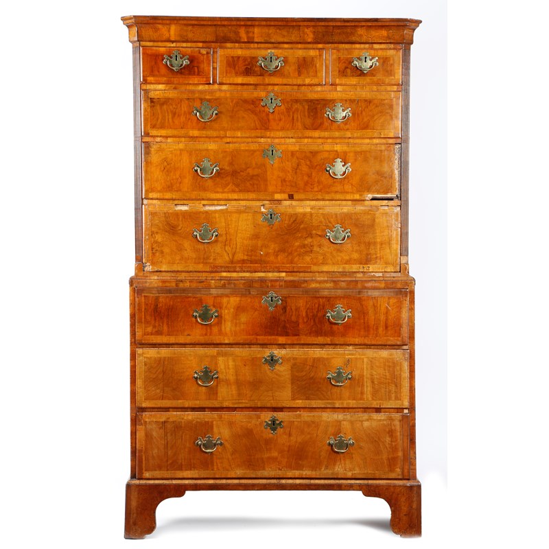 A George II walnut secretaire chest on chest, with three short and six long cross and feather banded drawers, with fluted angles and oak sides, the secretaire fitted with pigeonholes and drawers flanking a cupboard, 184.6cm high, 106.5cm wide, 54cm deep.