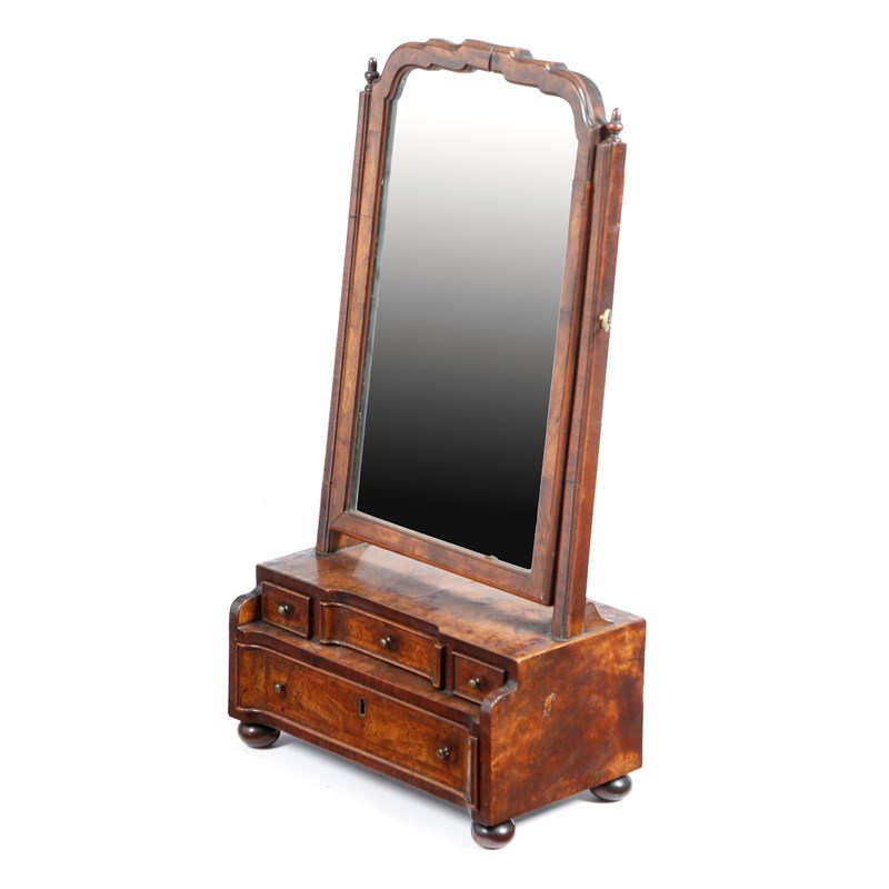 A George I walnut dressing table mirror, with feather banding, the later arched plate within a moulded frame, the uprights with turned acorn finials, the stepped box base fitted with four drawers, on later bun feet, 73.6cm high, 38.2cm wide, 21cm deep.